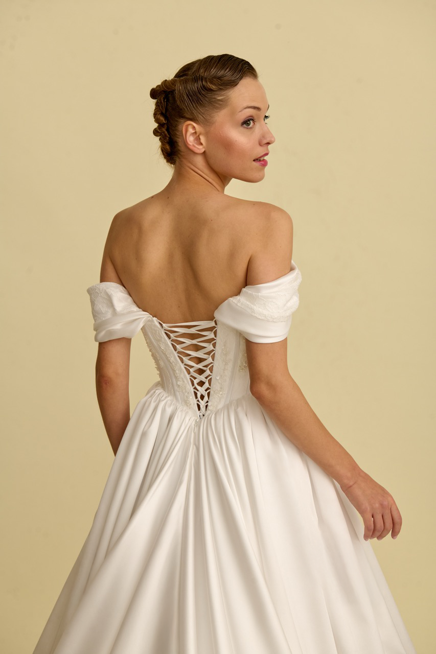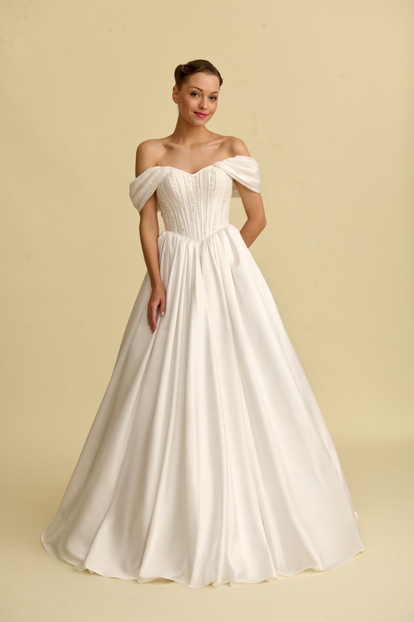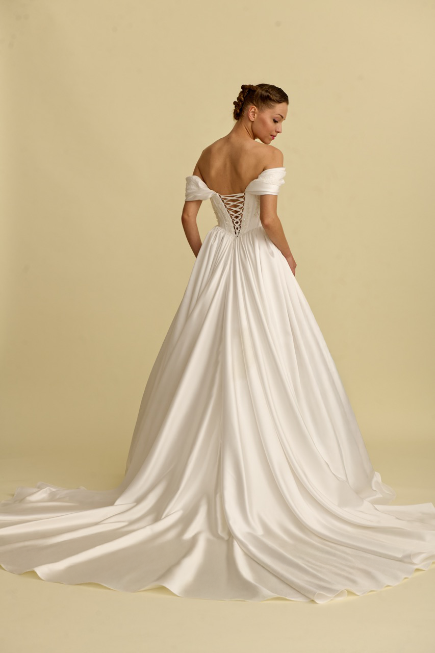 Combining the elegant shimmer of satin fabric with modern design lines, this princess-neckline wedding dress stands out with its flowing silhouette and sophisticated details. The princess neckline reinterprets the elegance of the past with today's modern wedding dress aesthetic, while the natural sheen of the satin fabric gives the design a magnificent and elegant character. Reflecting timeless sophistication, this model is designed for brides seeking an elegant and striking wedding dress.