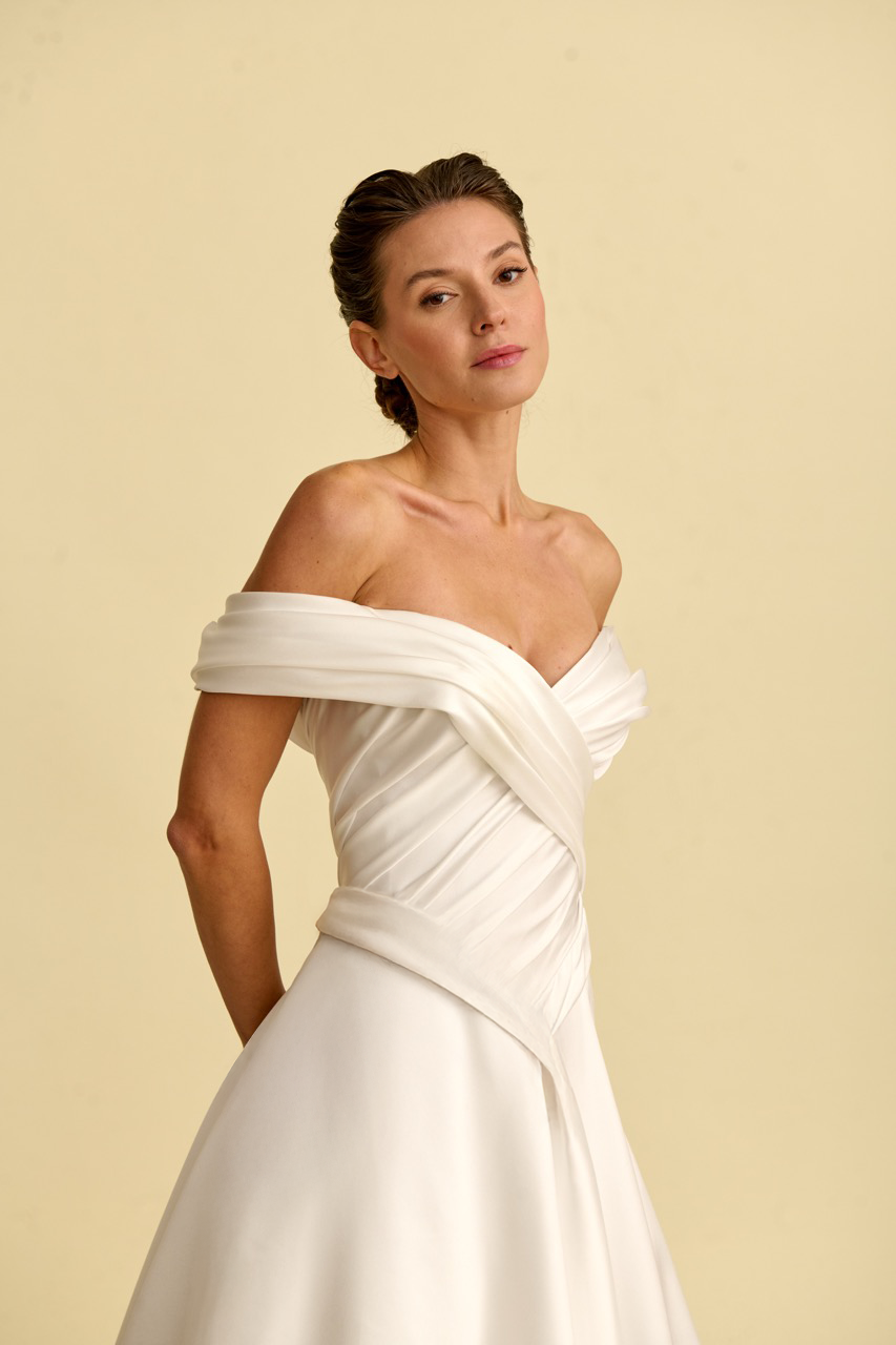 Reflecting the understated sheen of satin fabric, this A-line wedding dress offers modern elegance with its princess neckline detail and flowing silhouette. Minimalist design lines give the dress both sophistication and balance, while the A-line form creates an elegant and romantic look. It is a modern and stylish wedding dress designed for brides seeking a minimalist yet striking wedding dress.