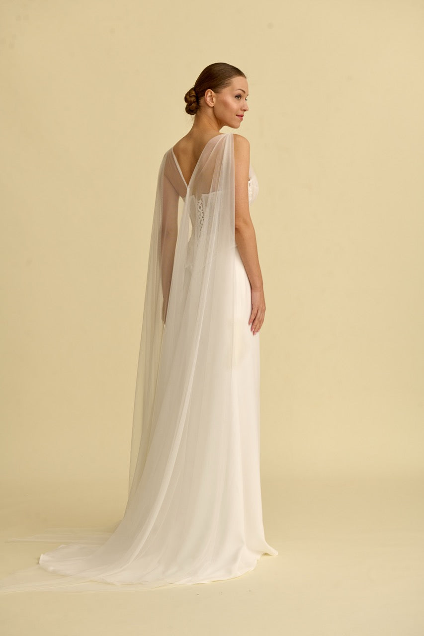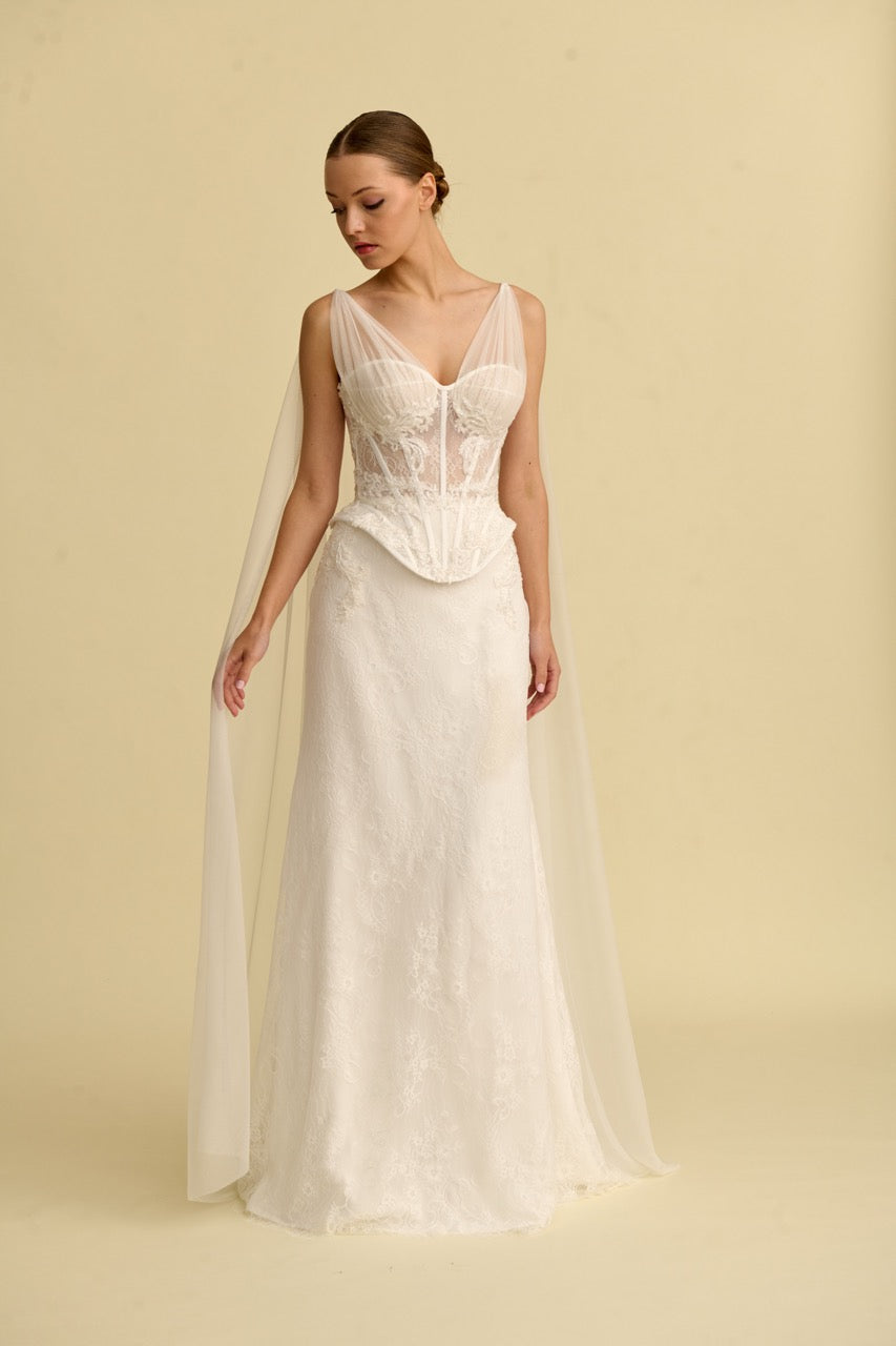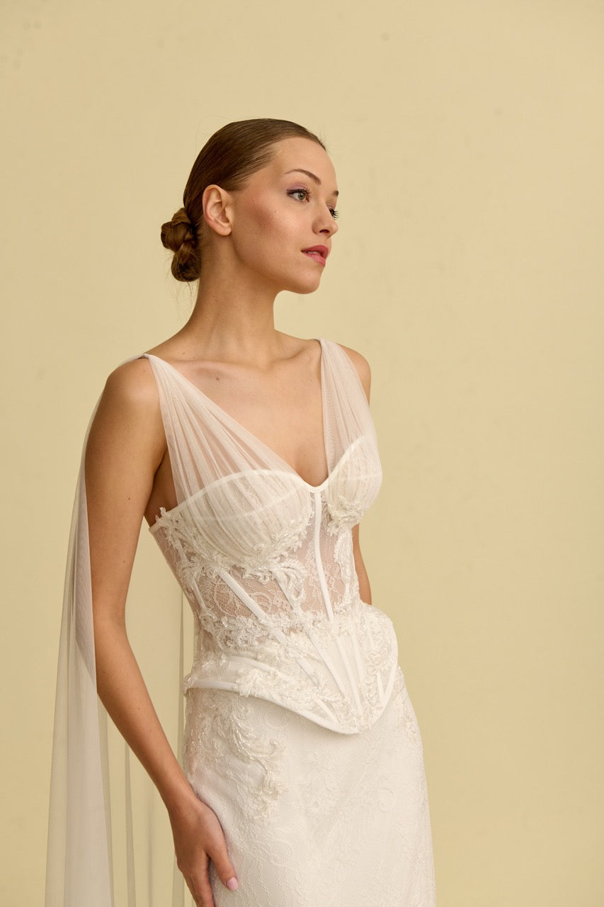 This mermaid-style wedding dress , distinguished by its detailed lace embellishments, offers a romantic look with its elegant tulle texture and flowing silhouette. The mermaid cut, which gracefully accentuates the figure, gives the dress a sophisticated character, while the bodice and back details highlight the design's elegance and striking appearance. It is a special wedding dress model designed for brides seeking a romantic and stylish mermaid wedding dress.