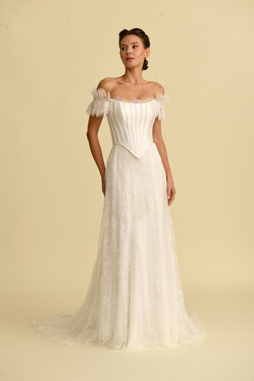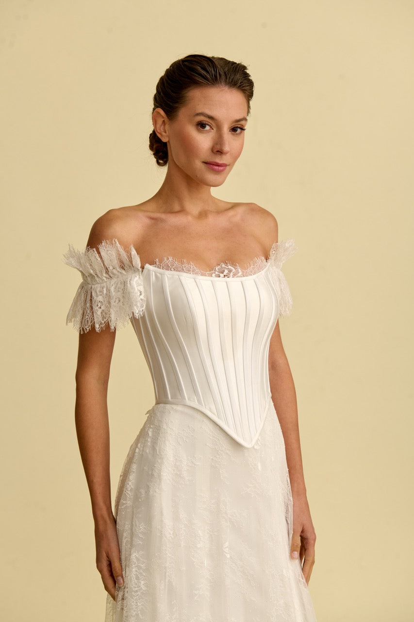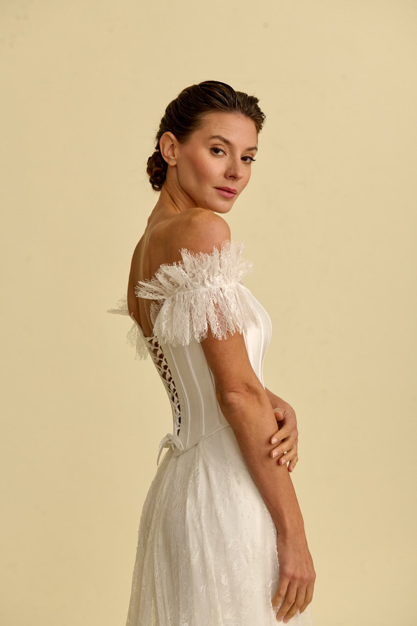 This mermaid-style wedding dress , distinguished by its corset-detailed strapless design, stands out with its elegant, figure-hugging form and flowing silhouette. Bohemian-inspired lace embellishments give the dress a romantic and sophisticated character, while the mermaid cut offers a modern and striking look. With its elegant details and romantic splendor, it's a special wedding dress designed for brides seeking a unique mermaid style.