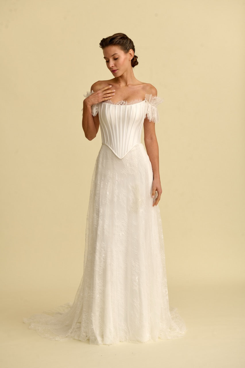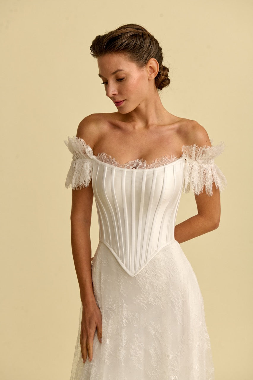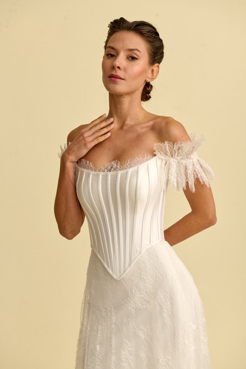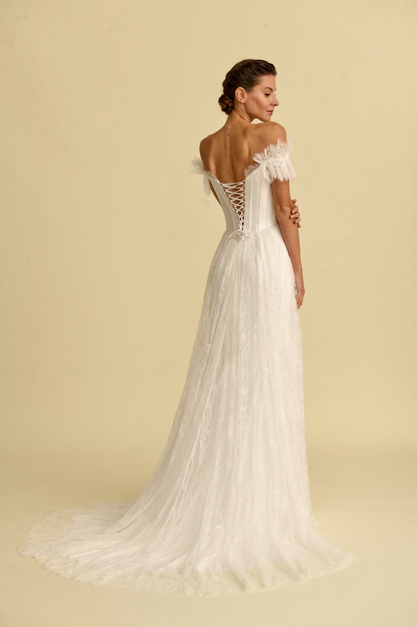 This mermaid-style wedding dress , distinguished by its corset-detailed strapless design, stands out with its elegant, figure-hugging form and flowing silhouette. Bohemian-inspired lace embellishments give the dress a romantic and sophisticated character, while the mermaid cut offers a modern and striking look. With its elegant details and romantic splendor, it's a special wedding dress designed for brides seeking a unique mermaid style.