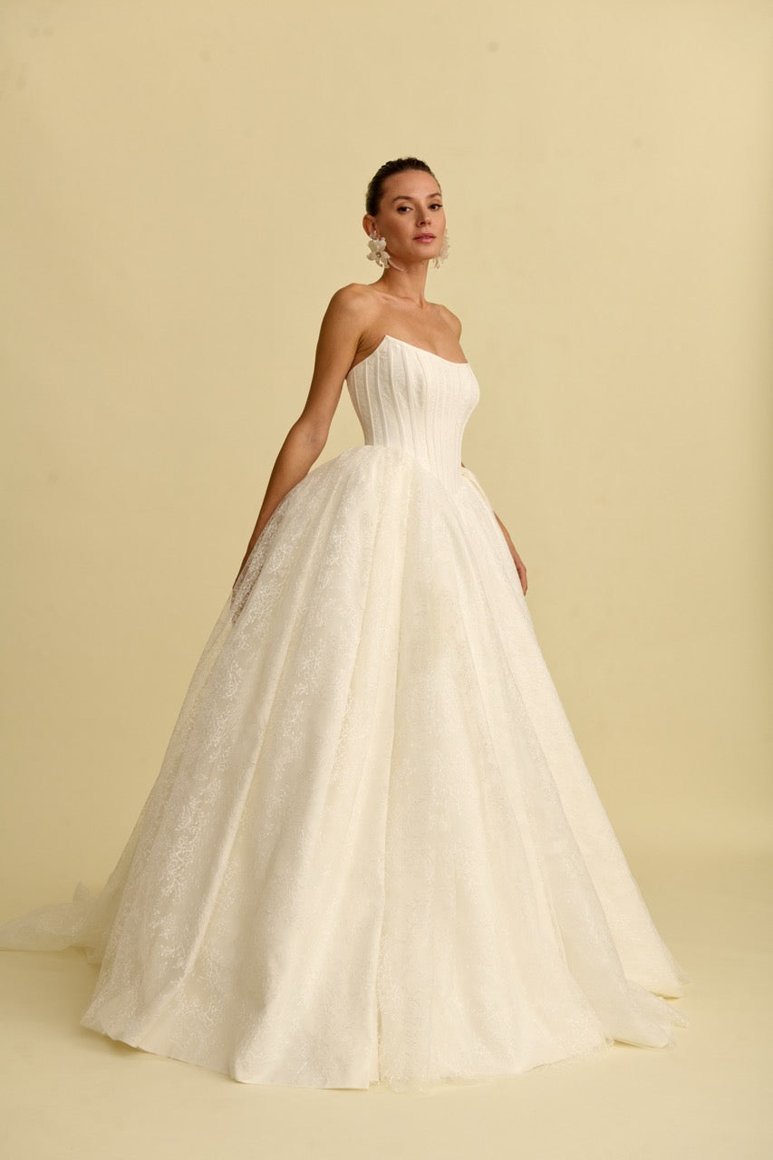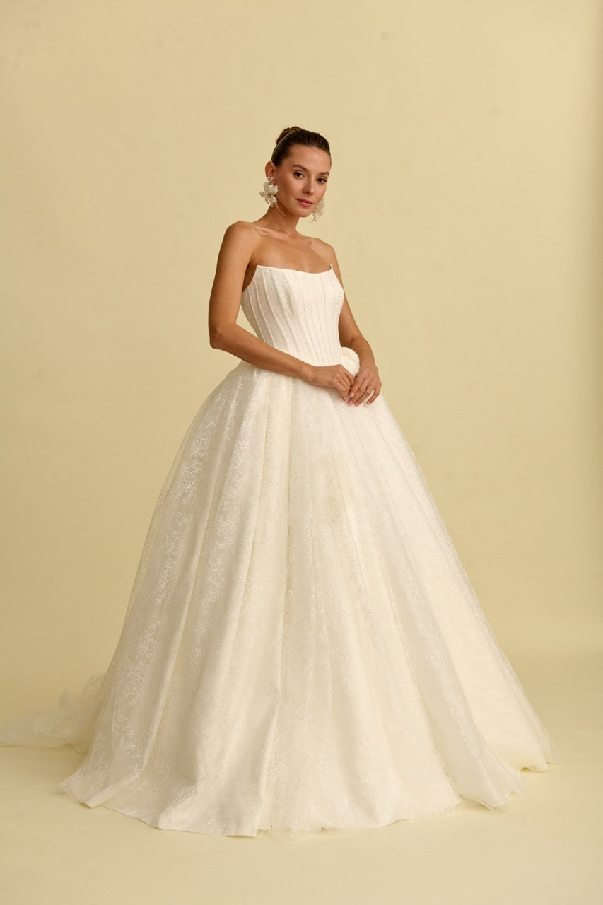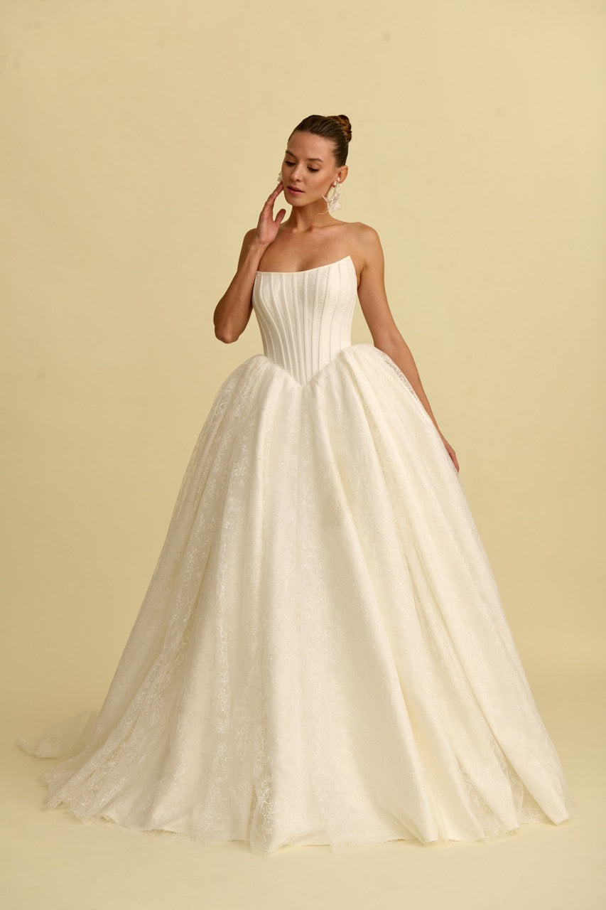 Straplez korse yapısıyla klasik hatları zarifçe ortaya çıkaran bu gelinlik, dantel detaylarıyla göz alıcı bir ihtişam yaratır. Modern zarafet ile klasik dokunun kusursuz uyumu.
