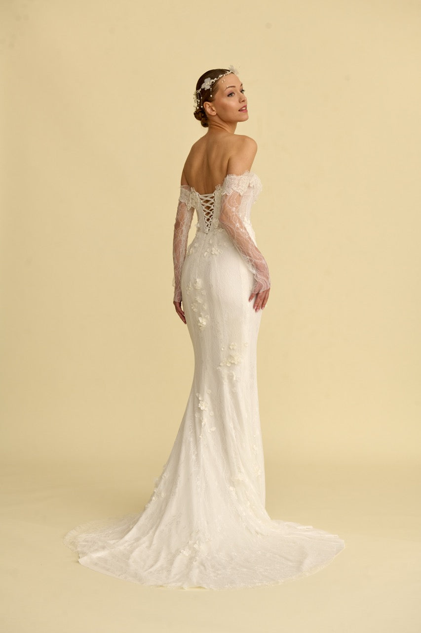 Narin detayları ile öne çıkan balık kesim, dantel detaylarıyla romantik bir zarafet kazanıyor. Balık form ve prenses yaka birleşimiyle modern bir ihtişama sahip balık gelinlik modeli.