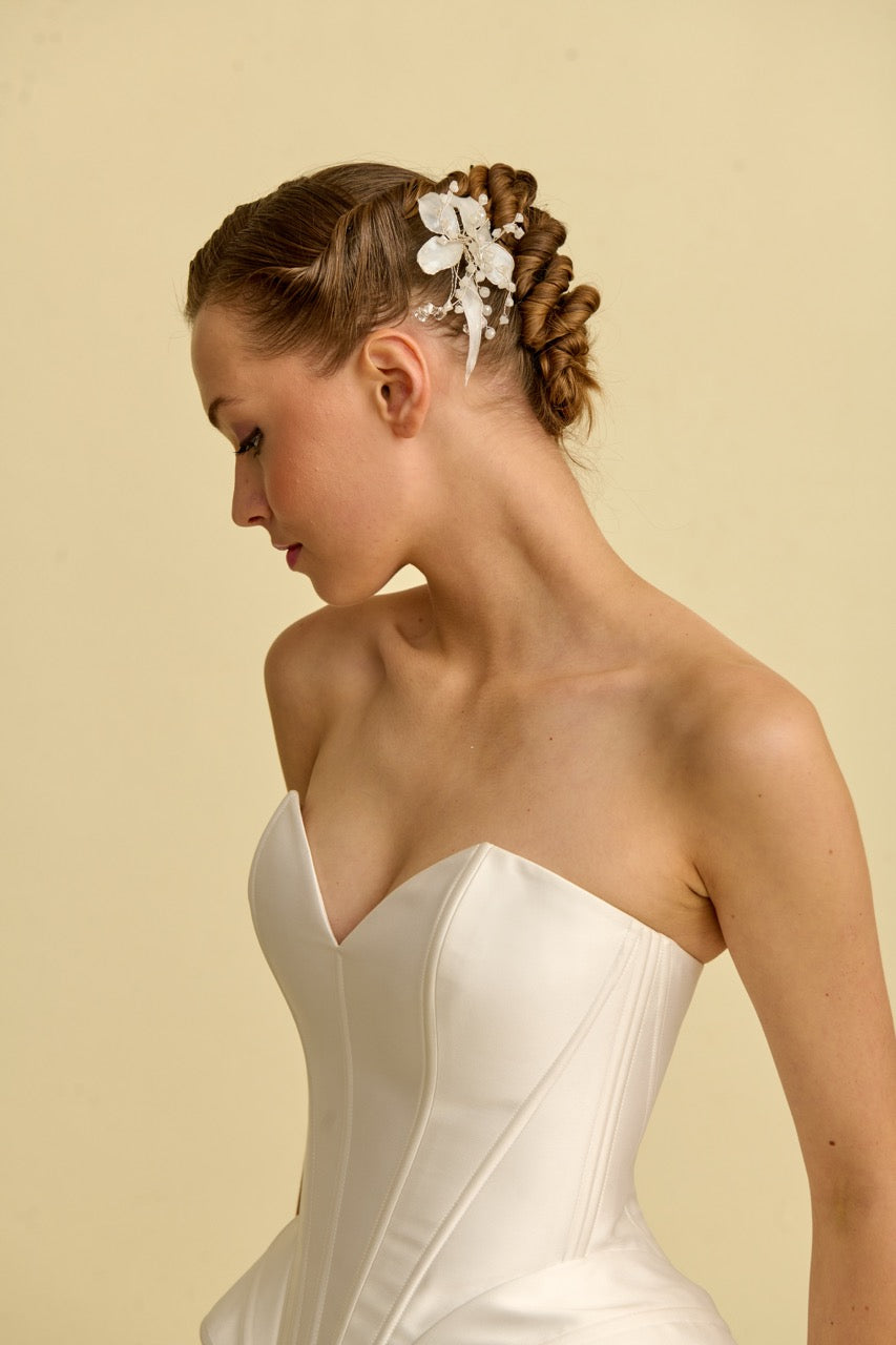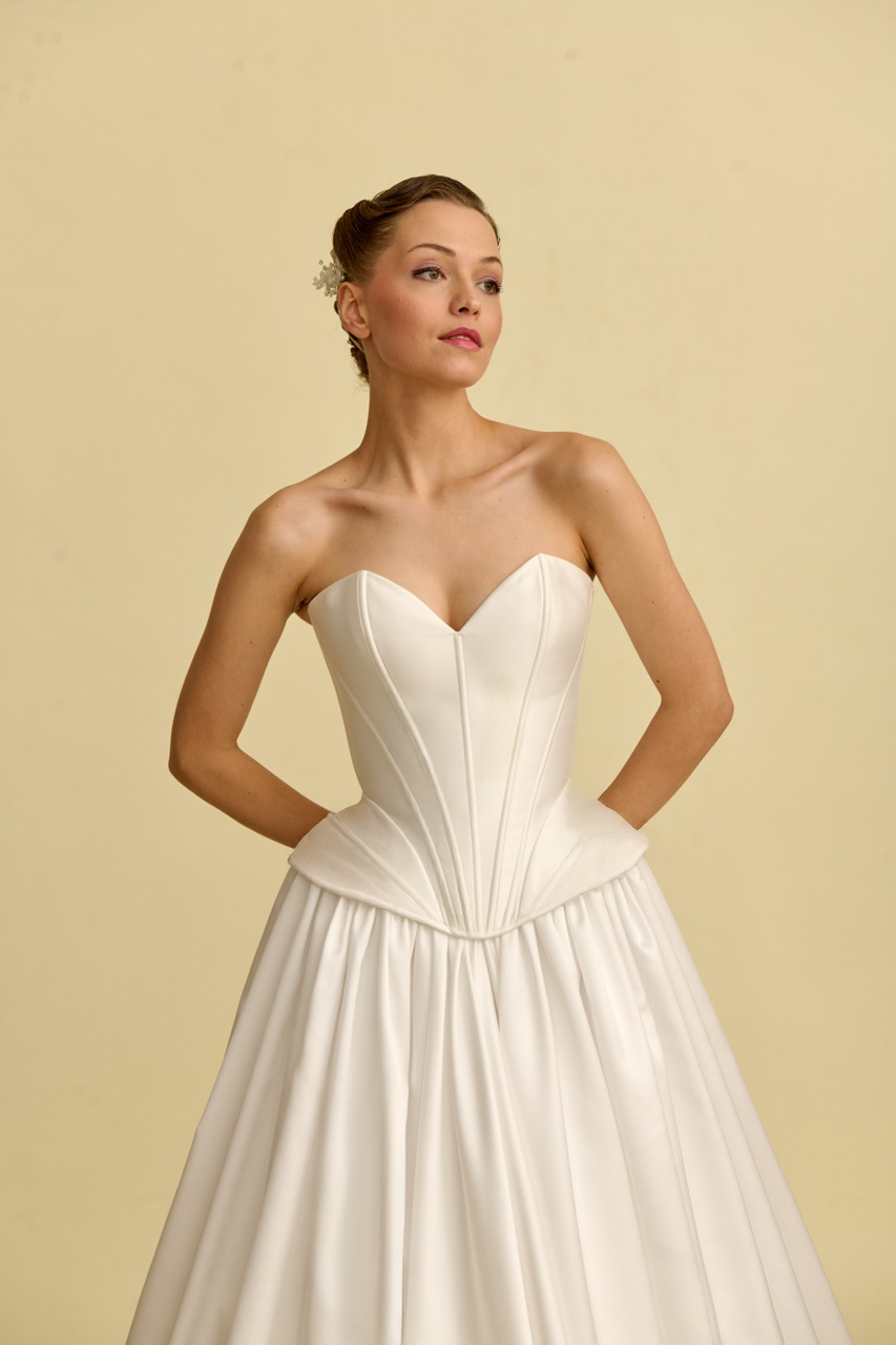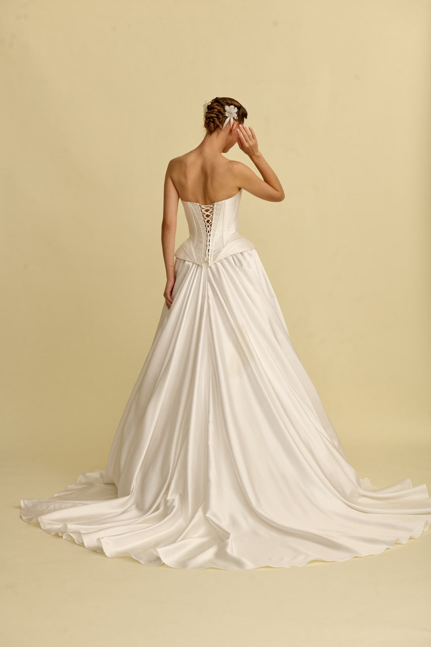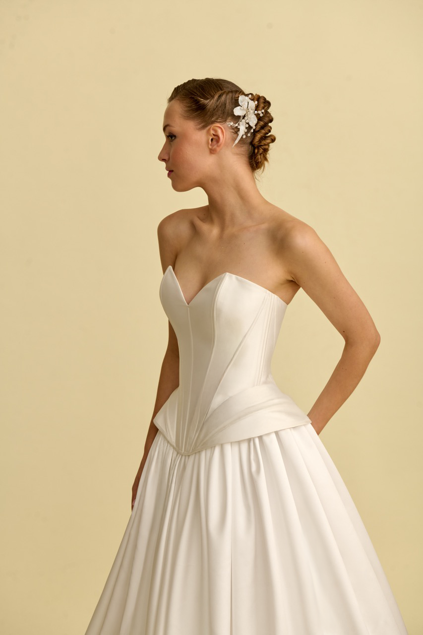 Satenin sade ışıltısı, modern prenses kesimiyle birleşiyor. Minimal detaylarıyla zarif, zamansız ve etkileyici bir görünüme sahip asaleti simgeleyen prenses gelinlik modeli.