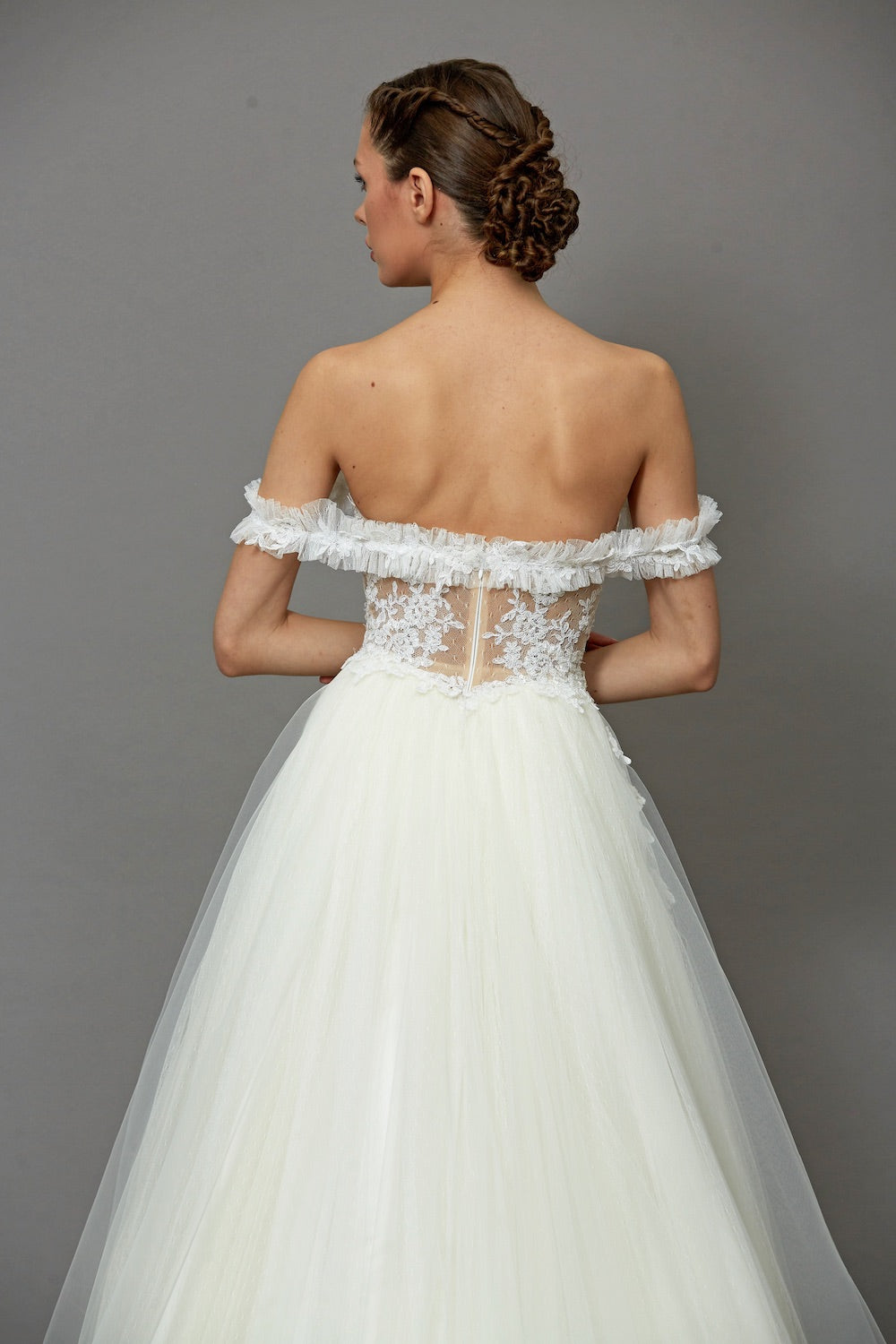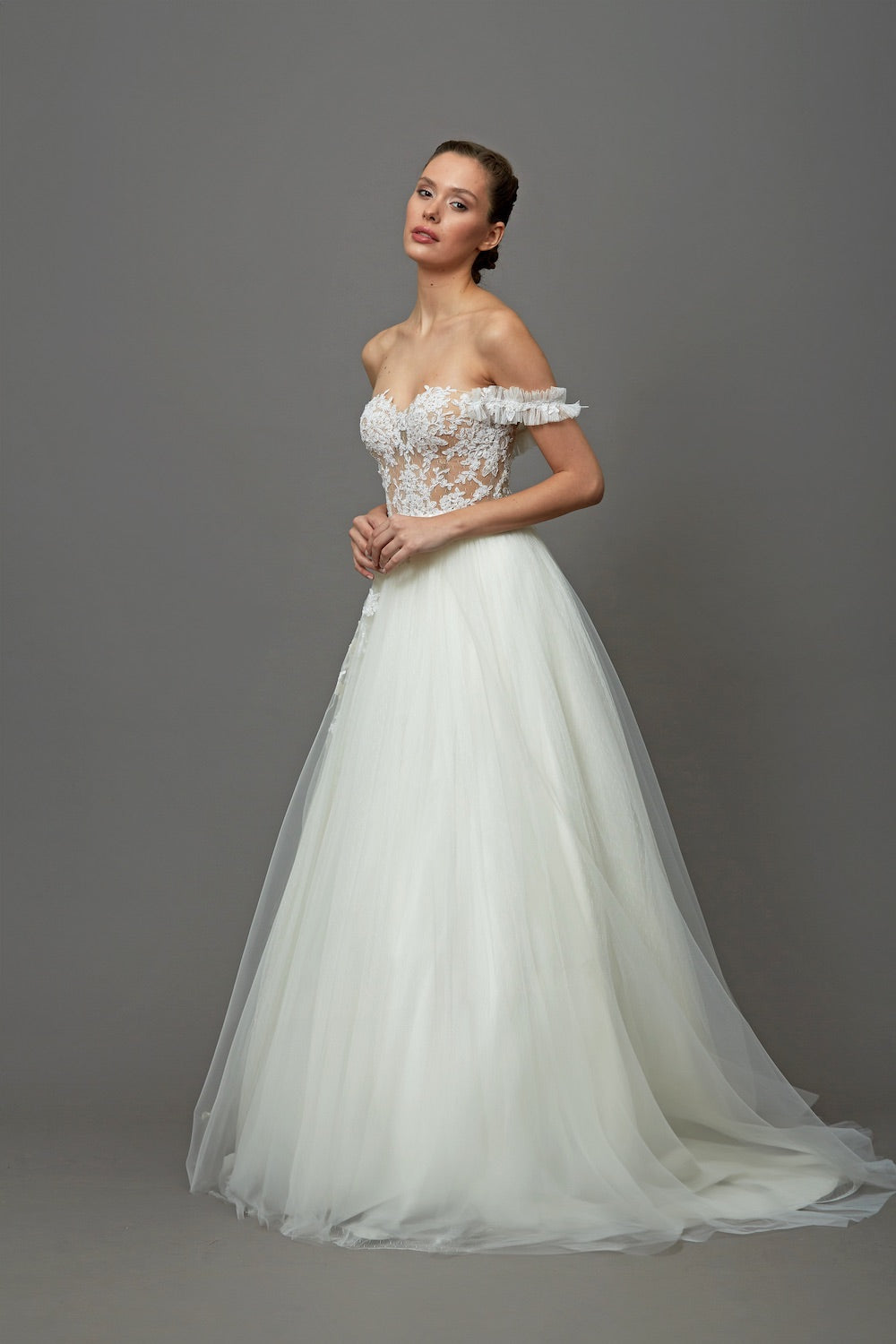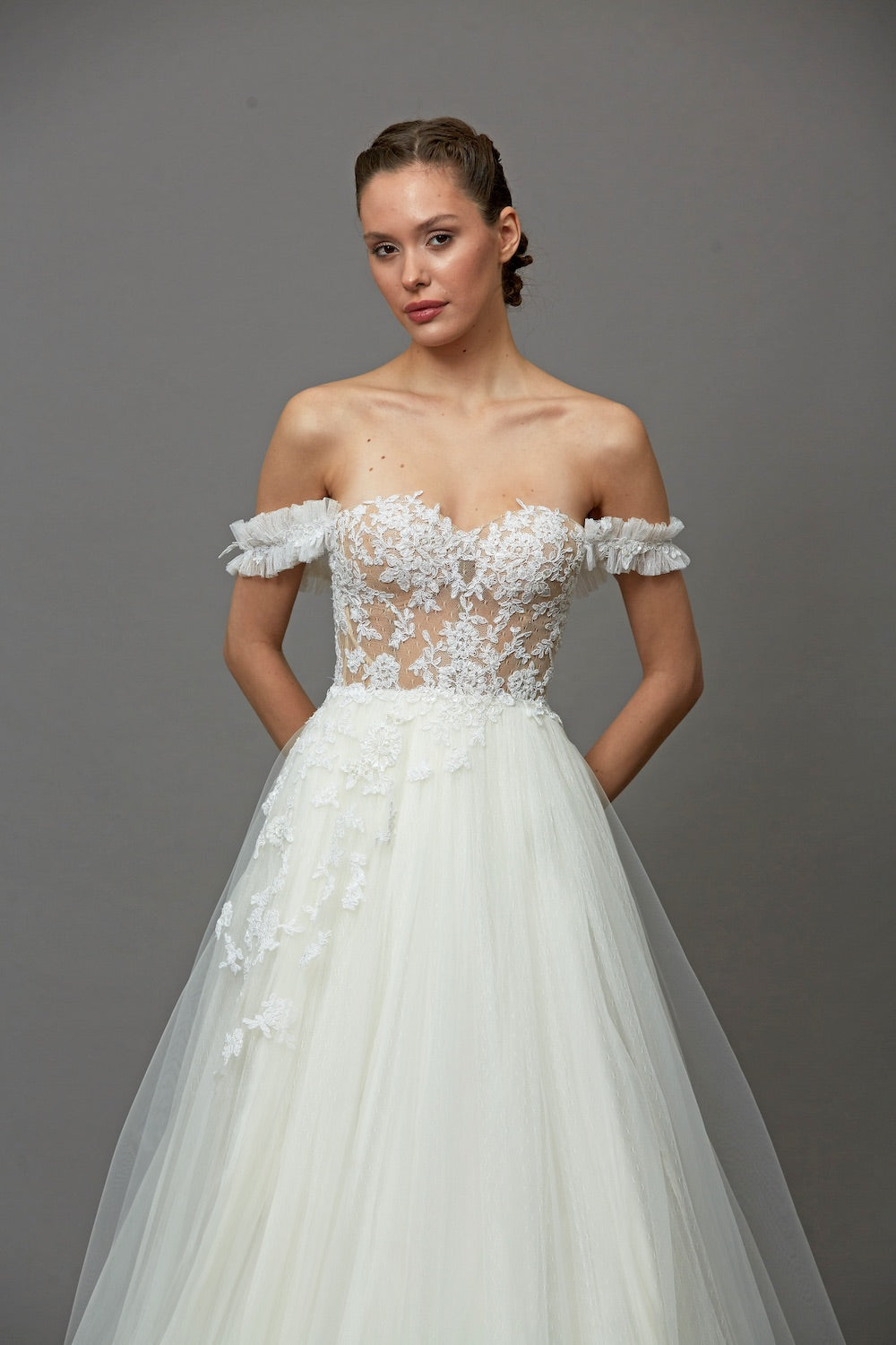 Romantik tasarım anlayışını modern çizgilerle buluşturan bu A kesim evaze gelinlik modeli, özgün askı detayı ve zarif dantel dokusuyla dikkat çeker. İnce işçilikle hazırlanan ışıltılı detaylar gelinliğe hem romantik hem de sofistike bir karakter kazandırırken, evaze formu akıcı ve zarif bir silüet sunar. Şık, romantik ve etkileyici bir gelinlik arayan gelin adayları için tasarlanmış özel bir gelinlik modelidir.
