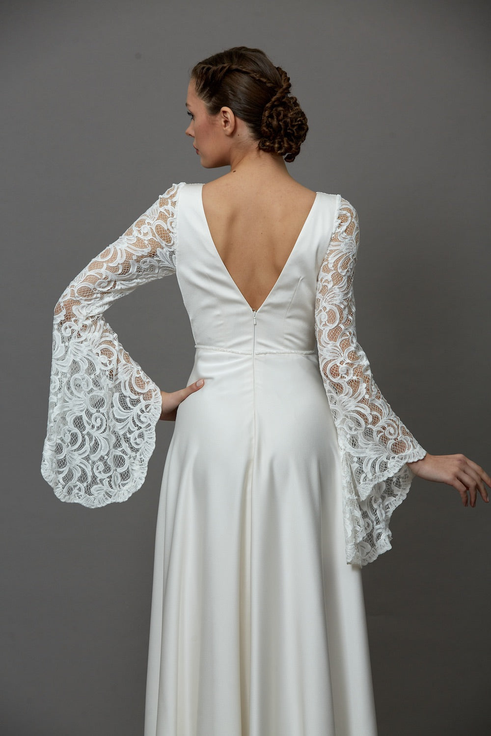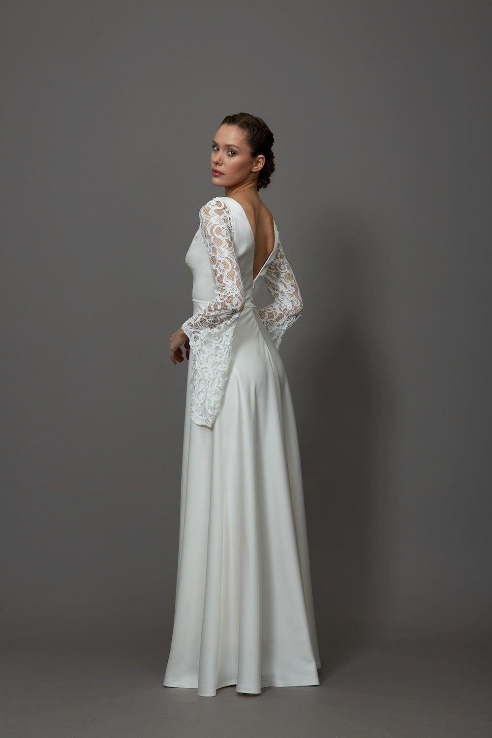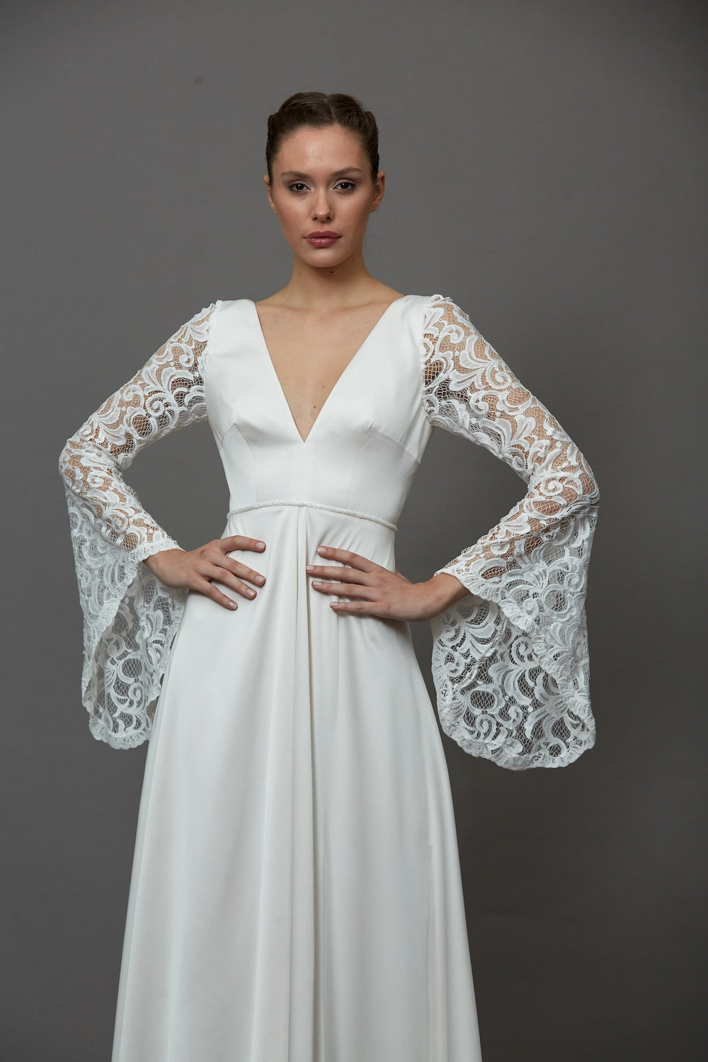 Vintage stilin zarif yorumunu yansıtan bu özel gelinlik, dantel kol detaylarıyla romantik ve etkileyici bir görünüm sunar. İncelikle işlenen dantel dokusu ve estetik tasarım çizgileri, romantizmin zarafetini tüm tasarıma yansıtır. Sade ama sofistike duruşuyla nikah törenleri için ideal bir stil sunan bu özgün tasarım, zarif bir nikah gelinlik modeli.